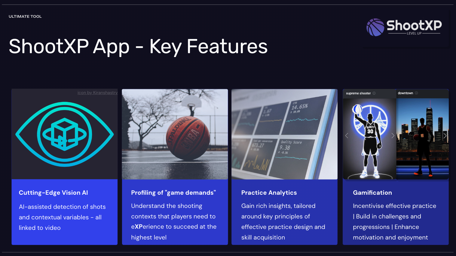 <table data-view="cards"><thead><tr><th></th><th></th><th></th><th data-hidden data-card-cover data-type="files"></th><th data-hidden data-card-target data-type="content-ref"></th></tr></thead><tbody><tr><td>Shooting AI</td><td></td><td></td><td><a href="https://1130393164-files.gitbook.io/~/files/v0/b/gitbook-x-prod.appspot.com/o/spaces%2FGRyaOc3jKLfMOTSlp6mD%2Fuploads%2F03G6DFg38ZpJ6StegN5Y%2Feye_1614537.png?alt=media&#x26;token=43adbac4-beba-4692-84dd-c4bb48e796e9">eye_1614537.png</a></td><td><a href="key-features/shooting-ai">shooting-ai</a></td></tr><tr><td>Game Profiling</td><td></td><td></td><td><a href="https://1130393164-files.gitbook.io/~/files/v0/b/gitbook-x-prod.appspot.com/o/spaces%2FGRyaOc3jKLfMOTSlp6mD%2Fuploads%2FROrjMOXIoPhqHq5qTfMM%2Fspalding-wet-street-court.png?alt=media&#x26;token=f788a609-9b28-441b-9db9-9c0f95af88e9">spalding-wet-street-court.png</a></td><td><a href="key-features/game-profiling">game-profiling</a></td></tr><tr><td>Practice Analytics</td><td></td><td></td><td><a href="https://1130393164-files.gitbook.io/~/files/v0/b/gitbook-x-prod.appspot.com/o/spaces%2FGRyaOc3jKLfMOTSlp6mD%2Fuploads%2F3E6ABM3KtaNkIuKtHFaJ%2Fanalytics-dashboard.png?alt=media&#x26;token=19ae8b20-b4bd-44e2-b93c-e80efc616389">analytics-dashboard.png</a></td><td><a href="key-features/practice-analytics">practice-analytics</a></td></tr><tr><td>Gamification</td><td></td><td></td><td><a href="https://1130393164-files.gitbook.io/~/files/v0/b/gitbook-x-prod.appspot.com/o/spaces%2FGRyaOc3jKLfMOTSlp6mD%2Fuploads%2FZ3PbyaWoyFFJRrojGxWl%2FScreen%20Shot%202023-12-16%20at%201.15.44%20pm.png?alt=media&#x26;token=d8def509-9db7-4d62-93a8-294d70fd15bd">supreme-shooter-badge.png</a></td><td><a href="key-features/gamification">gamification</a></td></tr></tbody></table>